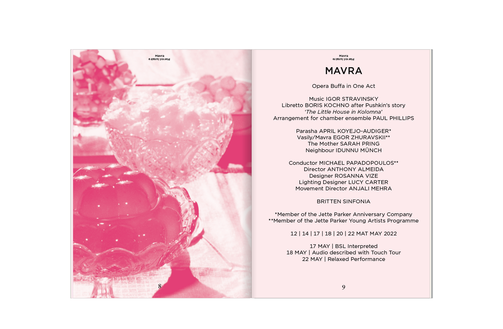 The double bill of Stravinsky’s Mavra and Schoenberg’s Pierrot Lunaire is an unusual pairing. What links them, as director’s Anthony Almeida staging makes clear, are ideas about gender and identity. In Mavra an oversized ceiling-light dominates a claustrophobic domestic space, illuminating it with sun-like clarity. In Pierrot Lunaire, that same domestic space is transformed by moonlight into an otherworldly realm. Graphic concept, art direction and editorial design of the programme, with photography from Alan Knox, Camilla Greenwell and Juno Calypso. The programme was divided in two, one for each opera, featuring two covers. The colour palette followed the leads from the stage design — silver/gray/black for Pierrot Lunaire and pink for Mavra.
