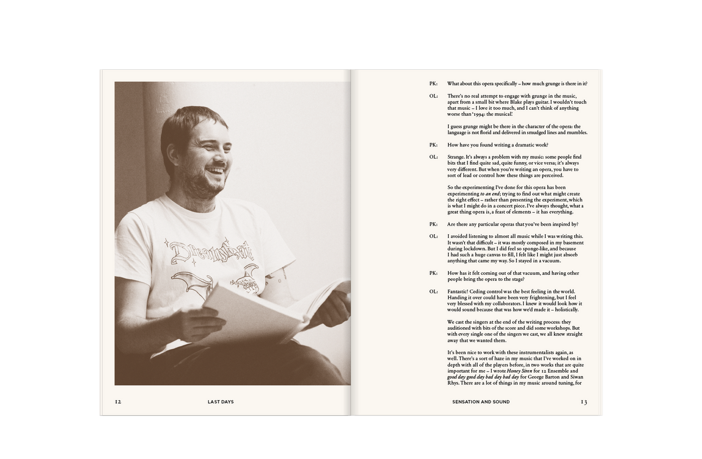 Last Days is an English-language opera in one act, with title and concept taken from the film by Gus van Sant — a fictionalised account of the last days of Kurt Cobain. The opera premiered at the Linbury Theatre in 2022. Graphic concept, art direction and editorial design of the programme, with commissioned photography inspired by the late 80's and 90's grunge music albums. The limited colour palette — brown and black — followed both the stage design and the costumes by Balenciaga.